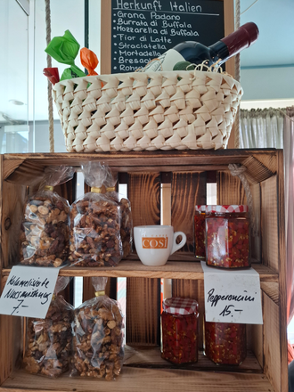 Schenke hausgemachte scharfen Peperoncini im Olivenöl, hergestellt nach originalem Nonna-Rezept aus Süditalien, oder unsere karamellisierte Nussmischung mit Baumnüsse, Pistazien, Haselnüsse. Auch als Korb- mit zusätzlich einer Flasche Wein und italienischen Biskuits und auf Wunsch mit einem Wertgutschein erhältlich.