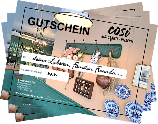 Diese Wertgutscheine sind im Ristorante cosi erhältlich oder wir senden sie nach der Überweisung per Twint per Post zu.